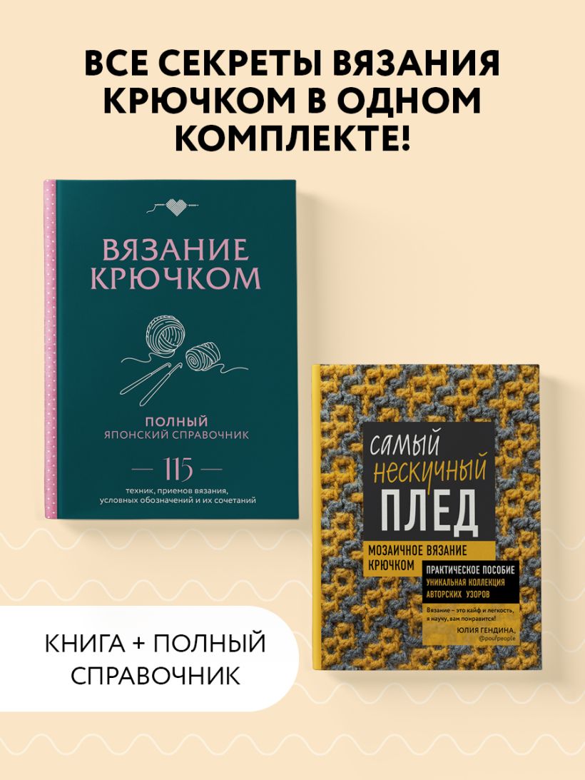 В комплект вошло 2 книги: Самый нескучный плед. Мозаичное вязание крючком. Практическое пособие и уникальная коллекция авторских узоров + Комплект для вязания крючком: справочник