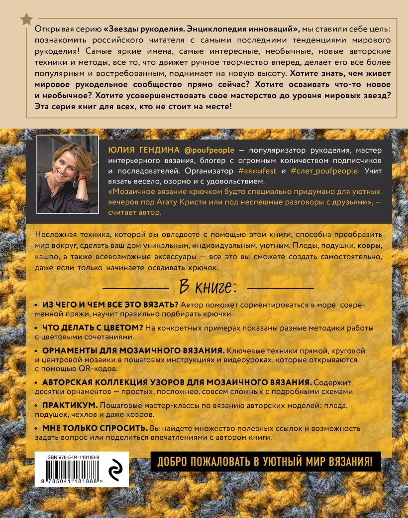 Именно поэтому она посвятила свою книгу своему любимому виду вязания крючком -- мозаичному. Несложная техника, которая полно, подробно и красочно представлена в этой книге, сделает ваш дом современным, стильным, уютным, и что особенно важно, индивидуальным! Вы сможете создать великолепные пледы, подушки, коврики, любые аксессуары, даже если только начинаете осваивать крючок.