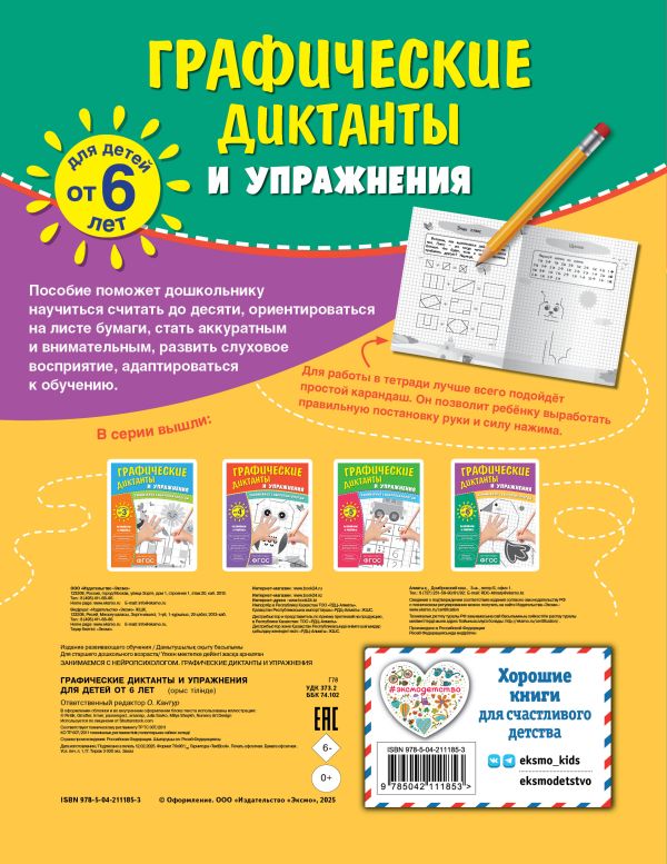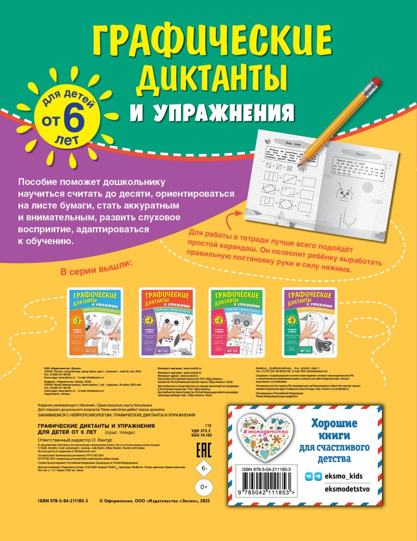Комплект состоит из пяти одинаковых книг «Графические диктанты и упражнения для детей от 6 лет» и разработан специально для детских подготовительных групп, садов, развивающих центров и других дошкольных учреждений.
