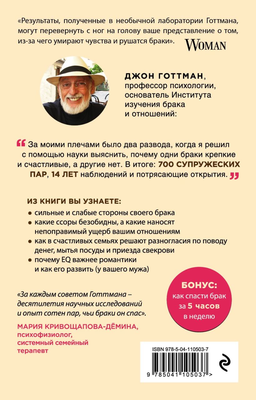 Джон Готтман — профессор психологии, самый цитируемый эксперт по отношениям и автор множества бестселлеров. Готтман может предсказать вероятность развода за 5 минут наблюдения за парой и вот уже более 30 лет приносит утреннюю чашку кофе своей жене.