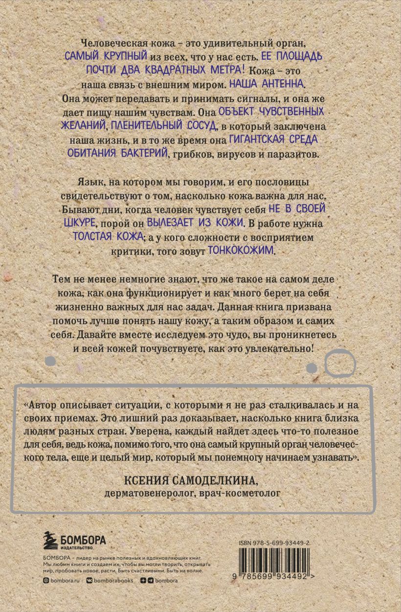 Человеческая кожа – удивительный орган, самый крупный из всех, что у нас есть. Ее площадь почти два квадратных метра! Кожа – это наша антенна. Она может передавать и принимать сигналы и дает пищу нашим чувствам. Это объект чувственных желаний, пленительный сосуд, в который заключена наша жизнь, в то же время - гигантская среда обитания бактерий, грибков, вирусов и паразитов. Немногие знают, что же такое кожа на самом деле, как она функционирует и как много берет на себя жизненно важных для нас задач. Эта книга призвана помочь лучше понять нашу кожу, и таким образом и самих себя. Вы проникнетесь и всей кожей почувствуете, как это увлекательно! Внимание! Информация, содержащаяся в книге, не может служить заменой консультации врача. Перед совершением любых рекомендуемых действий необходимо проконсультироваться со специалистом