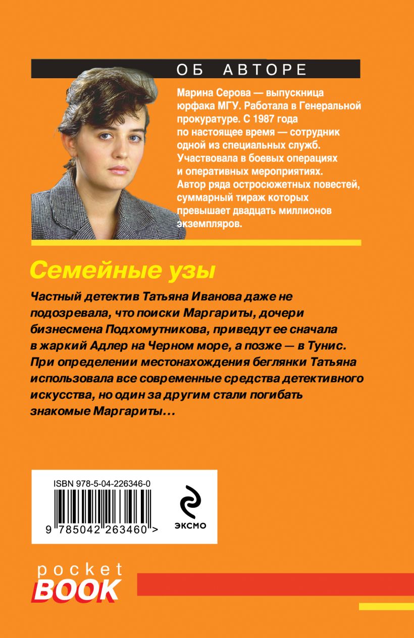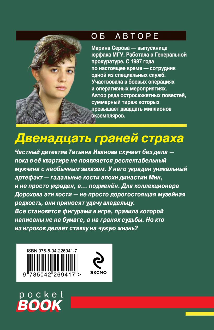 Марина Серова — феномен современного отечественного детективного жанра. Выпускница юрфака МГУ, работала в Генеральной прокуратуре. Участвовала в оперативных мероприятиях. Автор ряда остросюжетных повестей, суммарный тираж которых превышает двадцать миллионов экземпляров.