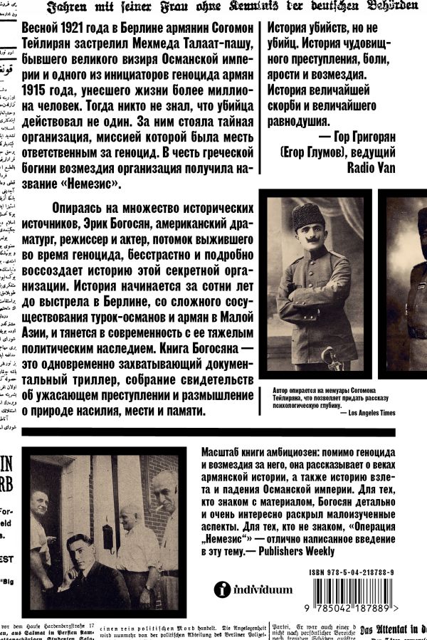 Операция Немезис: Весной 1921 года в Берлине армянин Согомон Тейлирян застрелил Мехмеда Талаат-пашу, бывшего великого визиря Османской империи и одного из инициаторов геноцида армян 1915 года, унесшего жизни более миллиона человек. Тогда никто не знал, что убийца действовал не один. За ним стояла тайная организация, миссией которой была месть ответственным за геноцид. В честь греческой богини возмездия организация получила название "Немезис". Опираясь на множество исторических источников, Эрик Богосян, американский драматург, режиссер и актер, потомок выжившего во время геноцида, бесстрастно и подробно воссоздает историю этой секретной организации. История начинается за сотни лет до выстрела в Берлине, со сложного сосуществования турок-османов и армян в Малой Азии, и тянется в современность с ее тяжелым политическим наследием. Книга Богосяна — это одновременно захватывающий документальный триллер, собрание свидетельств об ужасающем преступлении и размышление о природе насилия, мести и памяти.