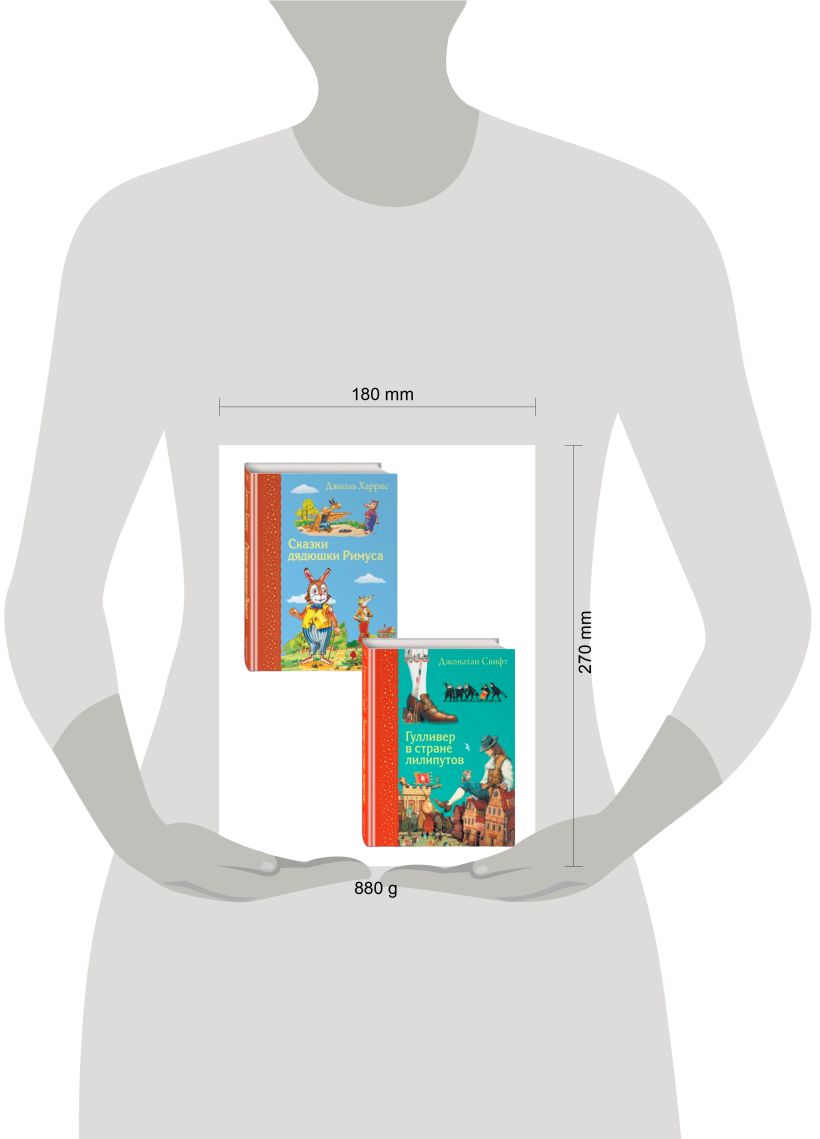 В комплект вошли 2 книги: “Гулливер в стране лилипутов” Джонатана Свифта с красочными подробными иллюстрациями Андрея Симанчука и “Сказки дядюшки Римуса” Джоэля Харриса с выразительными иллюстрациями Анатолия Воробьёва. Захватывающие истории об отважном мореплавателе Лемюэле Гулливере в Лилипутии и весёлые сказки о Братце Кролике, Братце Лисе, их соседях и друзьях увлекут и станут приятным времяпрепровождением.