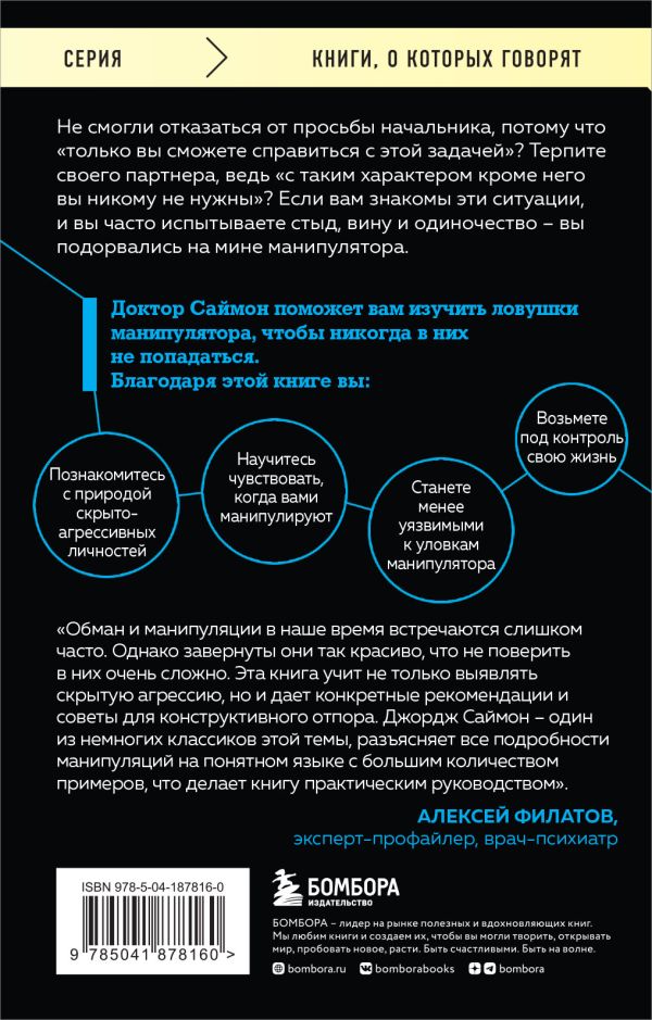 Доктор Саймон почти 30 лет изучает проблемных личностей и знает все о методах эффективной борьбы с ними. Автор уверен, что в арсенале манипуляторов десятки приемов и тактик, с помощью которых они пользуются добротой, состраданием, любовью и надеждой жертвы, оставляя взамен страхи и сомнения. Эта книга поможет вам изучить ловушки манипулятора, чтобы никогда в них не попадаться.