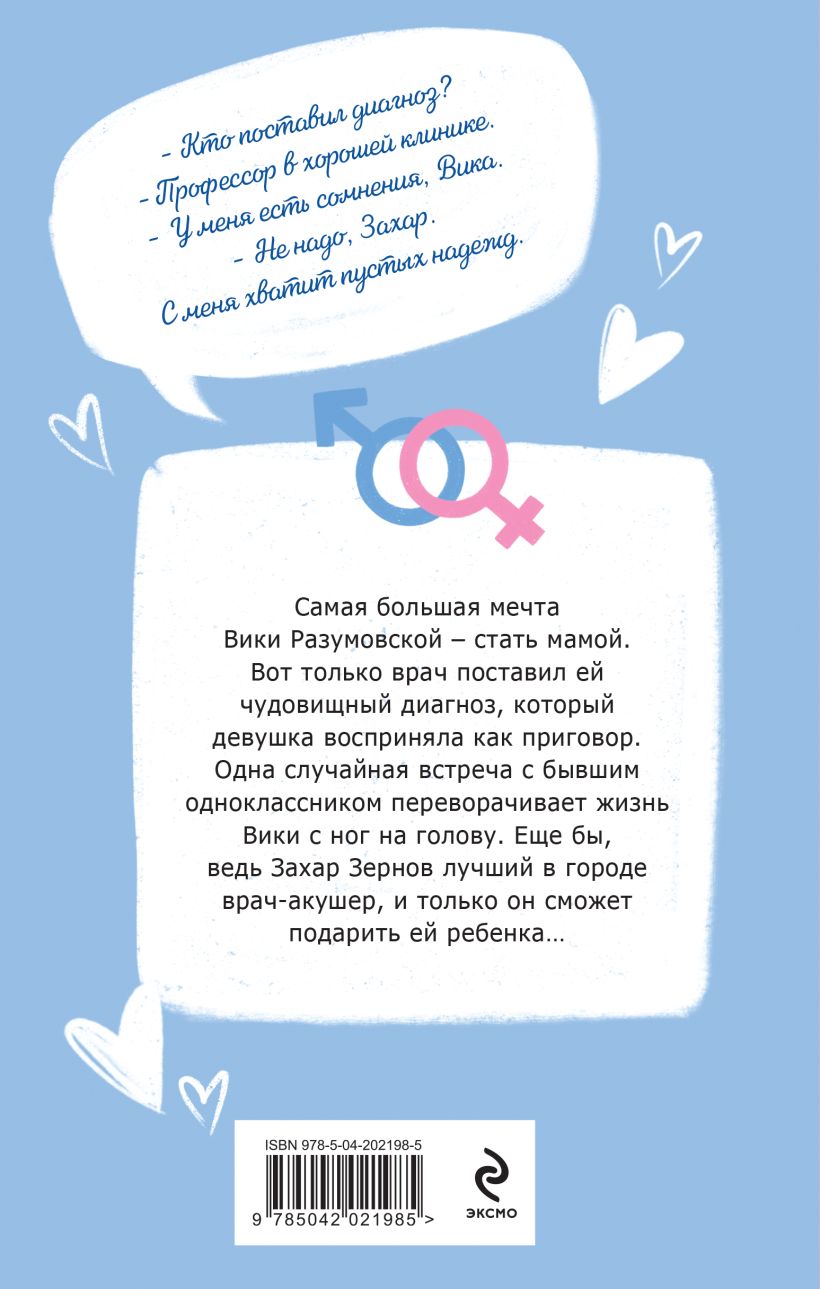 Самая большая мечта Вики Разумовской — стать мамой. Вот только врач поставил ей чудовищный диагноз, который девушка восприняла как приговор. Одна случайная встреча с бывшим одноклассником переворачивает жизнь Вики с ног на голову. Еще бы, ведь Захар Зернов лучший в городе врач-акушер, и только он сможет подарить ей ребенка…
