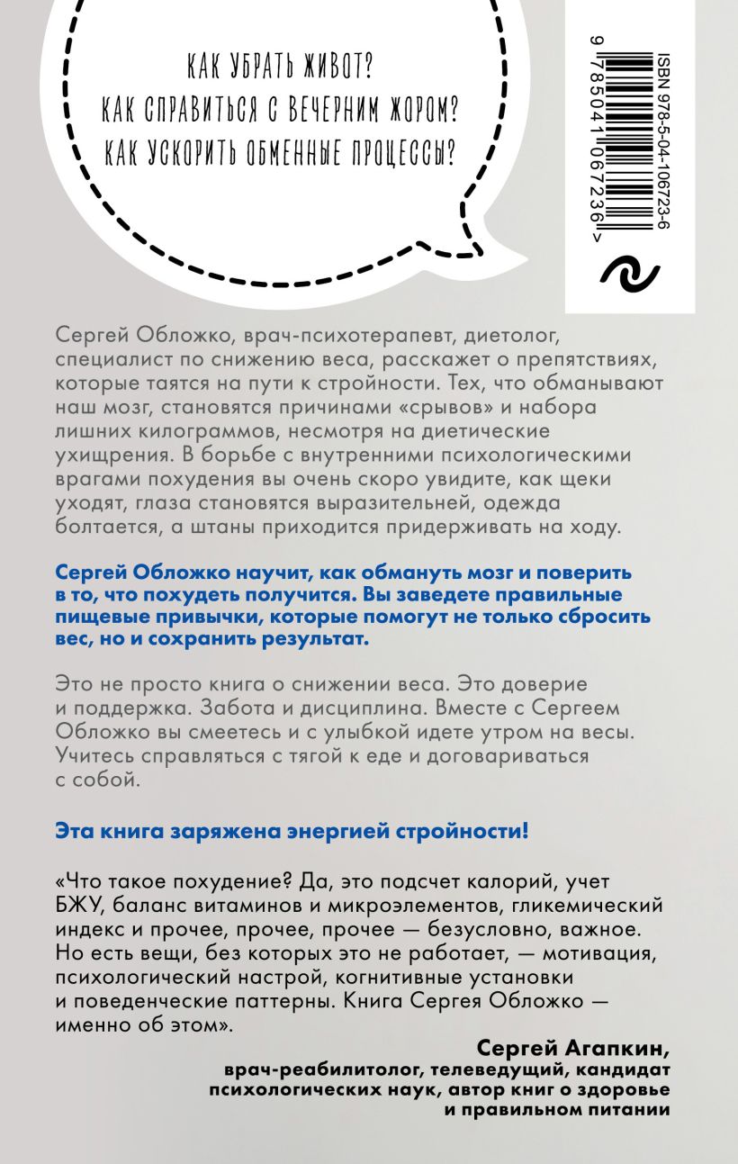 Это не просто книга о снижении веса. Это доверие и поддержка. Забота и дисциплина. Вместе с доктором Обложко вы смеетесь и идете утром на весы с надеждой. Учитесь справляться с тягой и договариваться с собой. Эта книга заряжена энергией стройности!