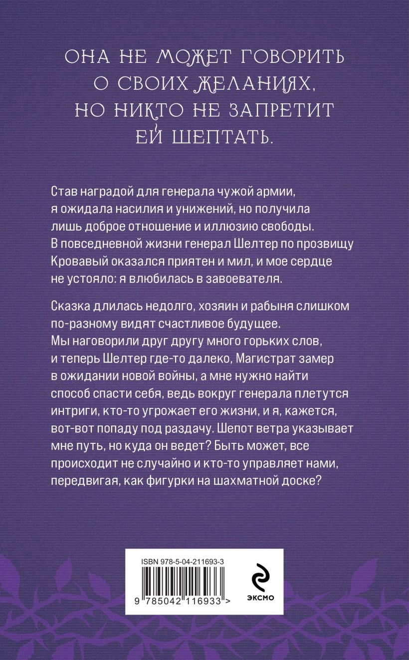 Став наградой для генерала чужой армии, я ожидала насилия и унижений, но получила лишь доброе отношение и иллюзию свободы. В повседневной жизни генерал Шелтер по прозвищу «Кровавый» оказался приятен и мил, и мое сердце не устояло: я влюбилась в завоевателя. Сказка длилась недолго, хозяин и рабыня слишком по-разному видят счастливое будущее. Мы наговорили друг другу много горьких слов, и теперь Шелтер где-то далеко, Магистрат замер в ожидании новой войны, а мне нужно найти способ спасти себя, ведь вокруг генерала плетутся интриги, кто-то угрожает его жизни, и я, кажется, вот-вот попаду под раздачу. Шепот ветра указывает мне путь, но куда он ведет? Быть может, все происходит не случайно и кто-то управляет нами, передвигая как фигурки на шахматной доске?