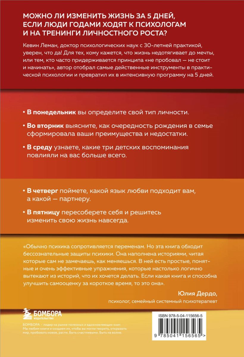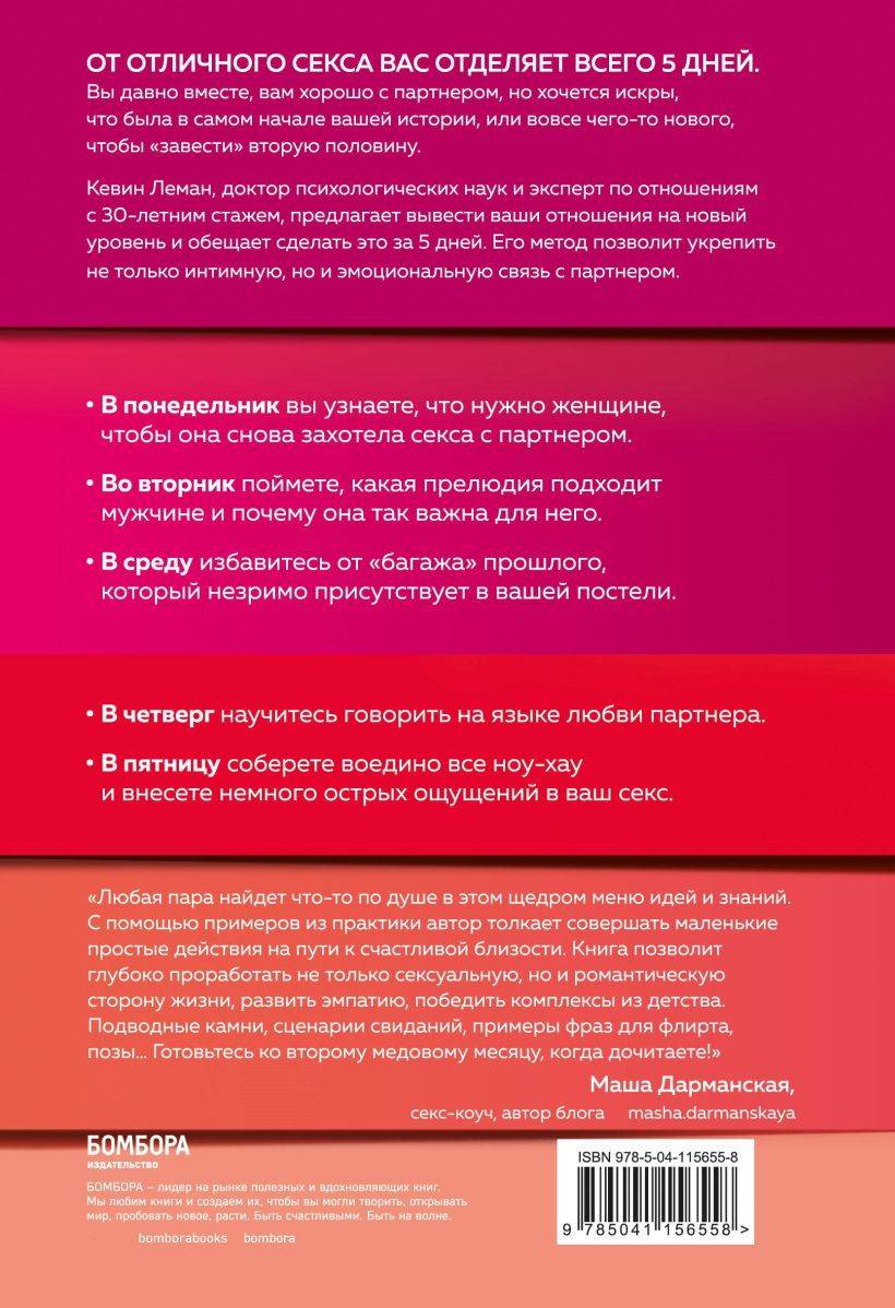 ЛУЧШИЕ СОВЕТЫ ПО СЕКСУ — В ОДНОЙ КНИГЕ! От отличного секса вас отделяет всего 5 дней. Вы давно вместе, вам хорошо с партнером, но хочется искры, что была в самом начале вашей истории, или вовсе чего-то нового, чтобы «завести» вторую половину. Кевин Леман, доктор психологических наук и эксперт по отношениям с 30-летним стажем, предлагает вывести ваши отношения на новый уровень и обещает сделать это за 5 дней. Его метод позволит укрепить не только интимную, но и эмоциональную связь с партнером. В понедельник вы узнаете, что нужно женщине, чтобы она снова захотела секса с партнером. Во вторник поймете, какая прелюдия подходит мужчине и почему она так важна для него. В среду избавитесь от «багажа» прошлого, который незримо присутствует в вашей постели. В четверг научитесь говорить на языке любви партнера. В пятницу соберете воедино все ноу-хау и внесете немного острых ощущений в ваш секс. ОТЗЫВ: «Любая пара найдет что-то по душе в этом щедром меню идей и знаний. Вооружившись примерами из практики, автор толкает совершать маленькие простые действия на пути к счастливой близости. Книга позволит глубоко проработать не только сексуальную, но и романтическую сторону жизни, развить эмпатию, победить комплексы из детства. Подводные камни, сценарии свиданий, примеры фраз для флирта, позы… Готовьтесь ко второму медовому месяцу, когда дочитаете!» — Маша Дарманская, секс-коуч