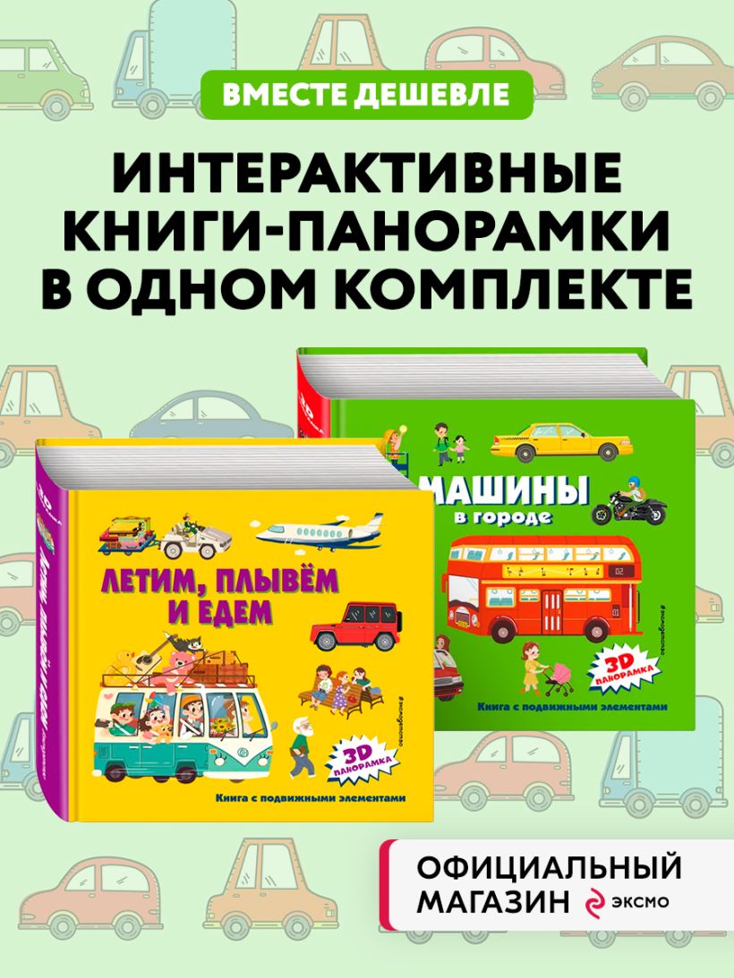 В комплект входят книги для детей с 3d-элементами «Летим, плывем и едем» и «Машины в городе». Эти книги становятся познавательными игрушками и помогают узнавать новые слова, принцип действия механизмов разных машин, развивают воображение.