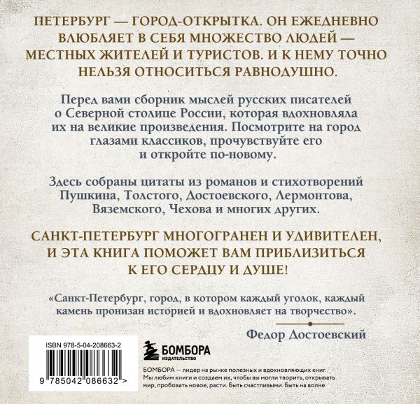 Санкт-Петербург, Петроград, Ленинград – как только его не называли! Но в сердцах русских писателей XVIII-XX веков это все один и тот же любимый и чарующий город на Неве. Здесь гуляли Пушкин и Белый, здесь творили Блок и Чехов, здесь писали свои произведения Достоевский и Некрасов. Познакомьтесь с отрывками из известных стихотворений и романов о Петербурге и прочувствуйте его глазами великих русских классиков из школьной программы! Яркий маленький подарок поможет познать душу Северной Венеции, и вы не сможете не влюбиться в культурную столицу России!
