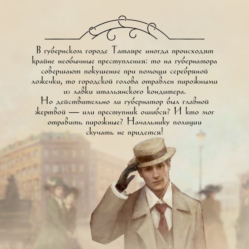 В губернском городе Татаяре иногда происходят крайне необычные преступления: то на губернатора совершают покушение при помощи серебряной ложечки, то городской голова отравлен пирожными из лавки итальянского кондитера. Но действительно ли губернатор был главной жертвой — или преступник ошибся? И кто мог отравить пирожные? Начальнику полиции скучать не придется!