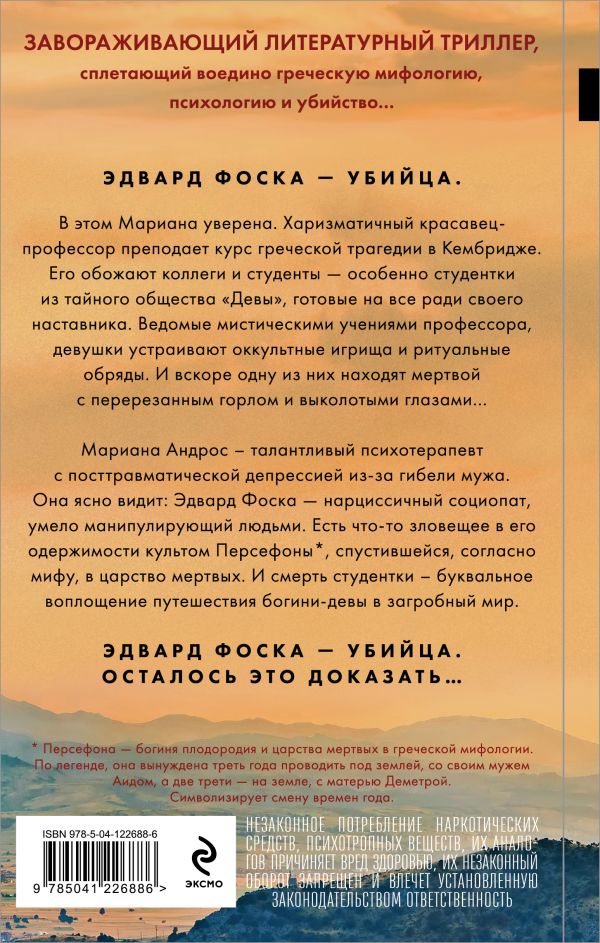 Эдвард Фоска — убийца. В этом Мариана уверена. Харизматичный красавец-профессор преподает курс греческой трагедии в Кембридже. Его обожают коллеги и студенты — особенно студентки из тайного общества «Девы», готовые на все ради своего наставника. Ведомые мистическими учениями профессора, девушки устраивают оккультные игрища и ритуальные обряды. И вскоре одну из них находят мертвой с перерезанным горлом и выколотыми глазами...