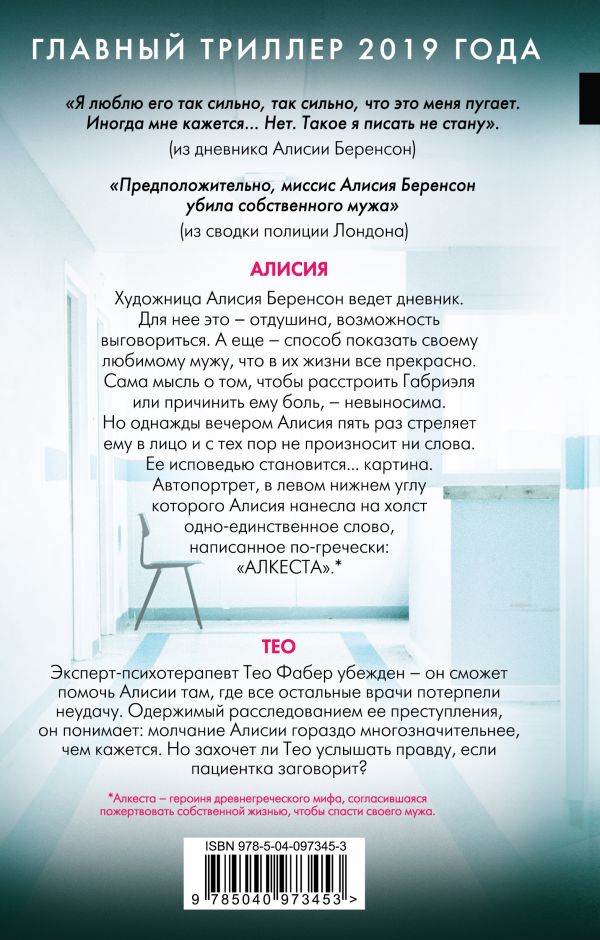 Жизнь Алисии Беренсон кажется идеальной. Известная художница вышла замуж за востребованного модного фотографа. Она живет в одном из самых привлекательных и дорогих районов Лондона в роскошном доме с большими окнами, выходящими в парк. Однажды поздним вечером, когда ее муж Габриэль возвращается домой с очередной съемки, Алисия пять раз стреляет ему в лицо. И с тех пор не произносит ни слова.
