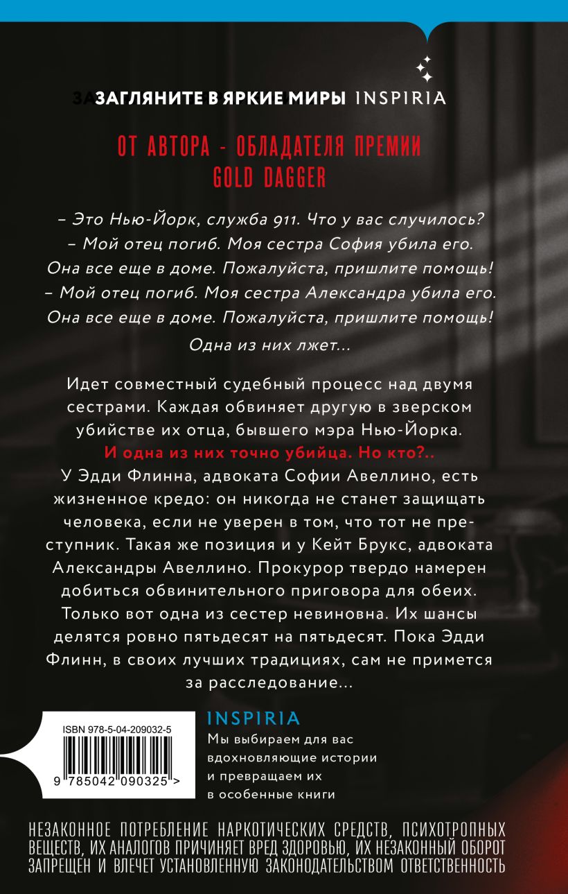 Идет совместный судебный процесс над двумя сестрами. Каждая обвиняет другую в зверском убийстве их отца, бывшего мэра Нью-Йорка. И одна из них точно убийца. Но кто?.. У Эдди Флинна, адвоката Софии Авеллино, есть жизненное кредо: он никогда не станет защищать человека, если не уверен в том, что тот не преступник. Такая же позиция и у Кейт Брукс, адвоката Александры Авеллино. Прокурор твердо намерен добиться обвинительного приговора для обеих. Только вот одна из сестер невиновна. Их шансы делятся ровно пятьдесят на пятьдесят. Пока Эдди Флинн, в своих лучших традициях, сам не примется за расследование…