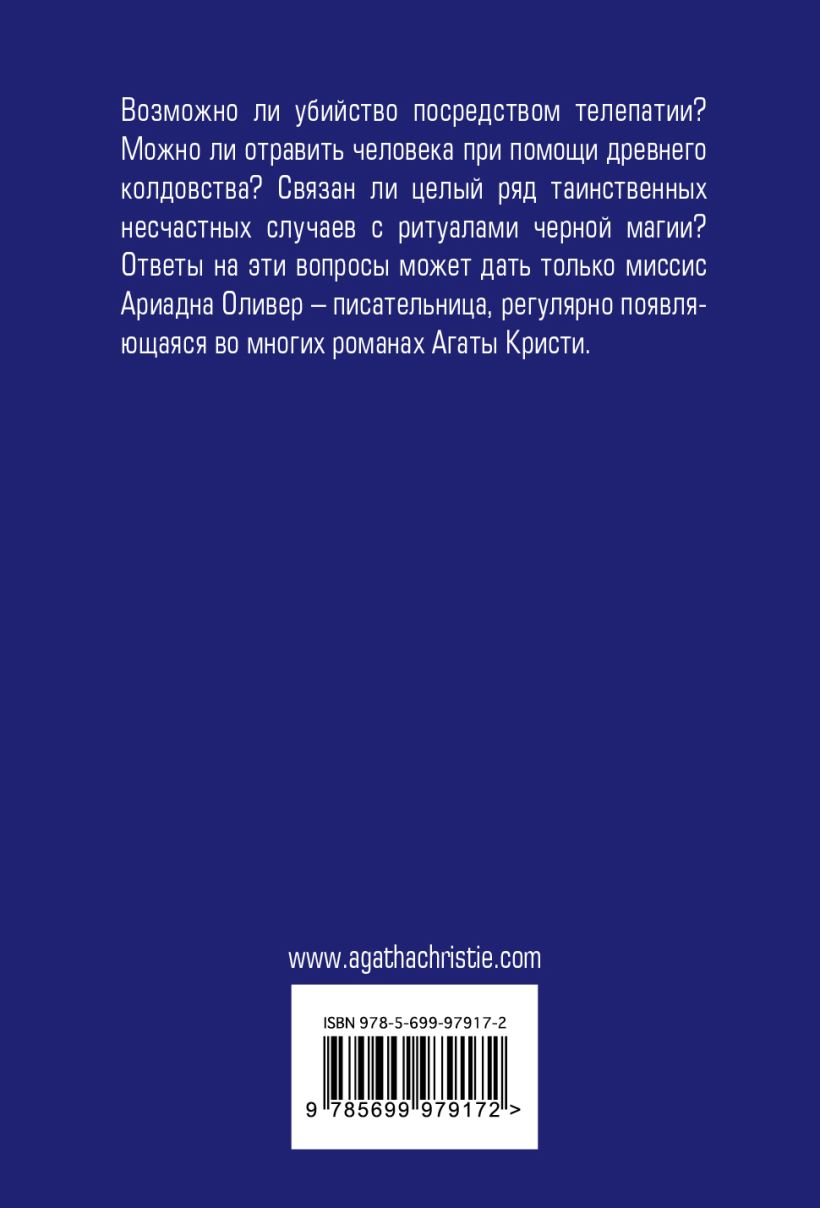 Возможно ли убийство посредством телепатии? Можно ли отравить человека при помощи древнего колдовства? Связан ли целый ряд таинственных несчастных случаев с ритуалами черной магии? Ответы на этот вопрос может дать только миссис Ариадна Оливер – писательница, регулярно появляющаяся во многих романах Агаты Кристи.