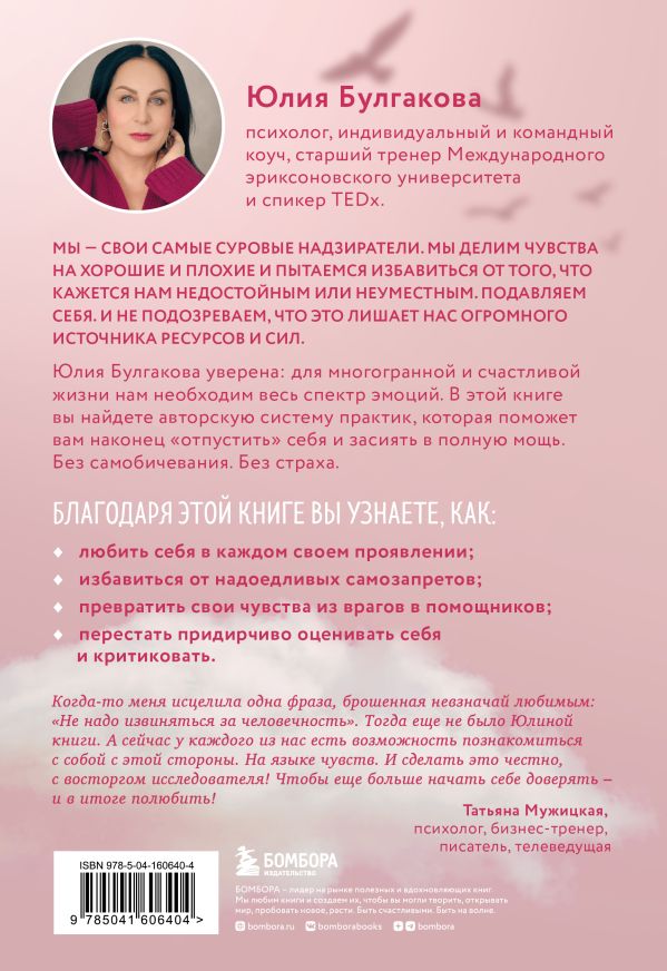 Мы - свои самые суровые надзиратели. Мы делим чувства на хорошие и плохие и пытаемся избавиться от того, что кажется нам недостойным или неуместным. Подавляем себя. И не подозреваем, что это лишает нас огромного источника ресурсов и сил. Юлия Булгакова уверена: для многогранной и счастливой жизни нам необходим весь спектр эмоций. В этой книге вы найдете авторскую систему практик, которая поможет вам наконец "отпустить" себя и засиять в полную мощь. Без самобичевания. Без страха.