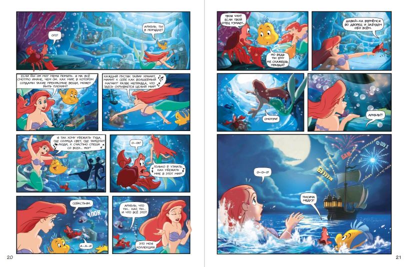 Встречайте адаптацию мультфильмов Disney в формате комикса! Отправьтесь на поиски единственного сына вместе рыбой-клоуном Марлином и рассеянной рыбкой Дори, поверьте в исполнение заветной мечты вместе с русалочкой Ариэль.