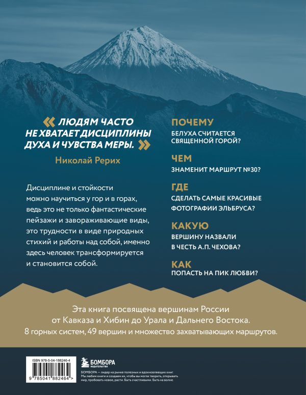 Алтай, Кавказ, Саяны, горы Сибири и Дальнего Востока — возможно, кому-то на первый взгляд все горы кажутся одинаковыми. Но это далеко не так, и дело не только в природных условиях. Благодаря этой книге вы сможете отправиться в захватывающее путешествие по горным вершинам России — от Эльбруса на Кавказе до пика Чехова на Сахалине.