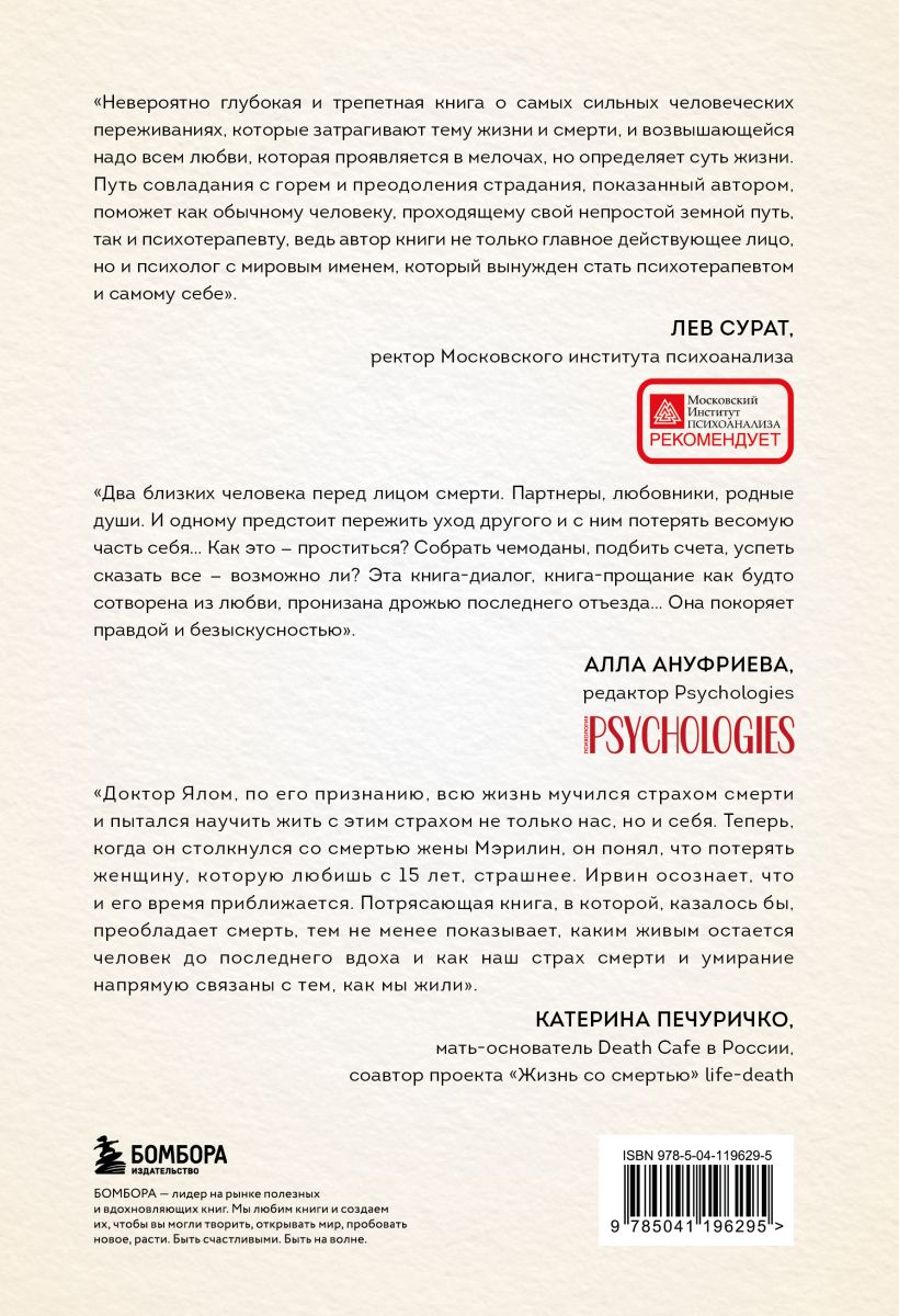 У всемирно известного психотерапевта и писателя Ирвина Ялома было множество благословений в жизни — любящая семья, дом в Пало-Альто под великолепным дубом, большой круг друзей, преданные читатели по всему миру и долгий счастливый брак. Но и Ирвин Ялом не смог избежать встречи со смертью, когда у его жены Мэрилин был диагностирован рак. С мудростью прожитых лет и бесконечной любовью и уважением, Ирв и Мэрилин исследуют вопросы близости и горя. Чередуя рассказы о последних месяцах, проведенных вместе, и о первых месяцах, проведенных Ирвом в одиночестве, супруги Ялом предлагают нам редкую возможность взглянуть в лицо смерти и справиться с потерей любимого.