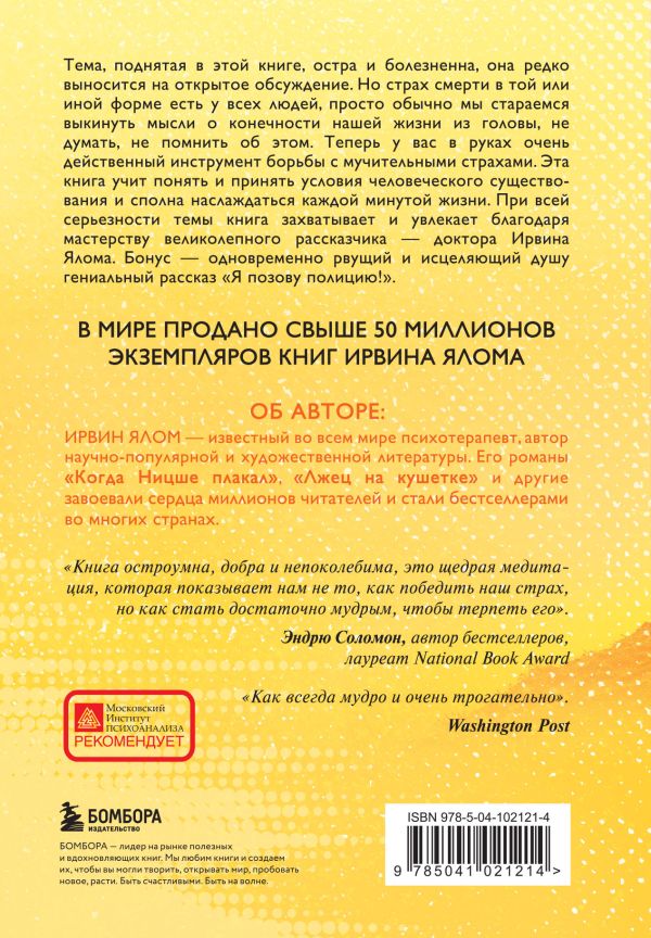 Тема, поднятая в этой книге, остра и болезненна, она редко выносится на открытое обсуждение. Но страх смерти в той или иной форме есть у всех людей, просто обычно мы стараемся выкинуть мысли о конечности нашей жизни из головы, не думать, не помнить об этом. Теперь у вас в руках очень действенный инструмент борьбы с мучительными страхами. Эта книга учит понять и принять условия человеческого существования и сполна наслаждаться каждой минутой жизни. При всей серьезности темы книга захватывает и увлекает благодаря мастерству великолепного рассказчика — доктора Ирвина Ялома. Бонус — одновременно рвущий и исцеляющий душу гениальный рассказ «Я позову полицию!».