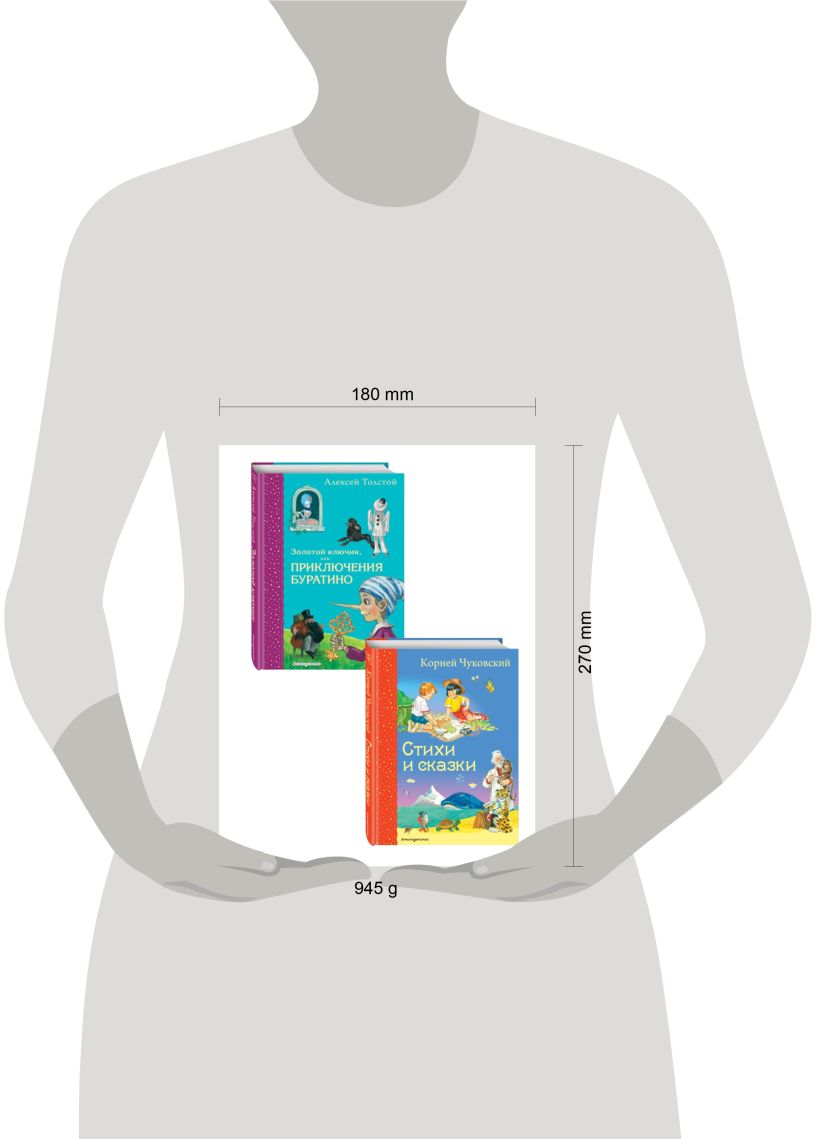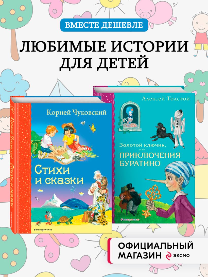 В комплект вошли 2 книги: «Стихи и сказки» Корнея Чуковского и «Золотой ключик, или Приключения Буратино» Алексея Толстого.