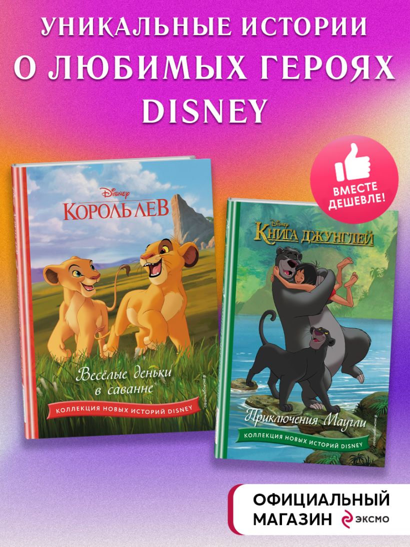 В комплект вошли две увлекательные истории: «Книга джунглей. Приключения Маугли» и «Король лев. Весёлые деньки в саванне».