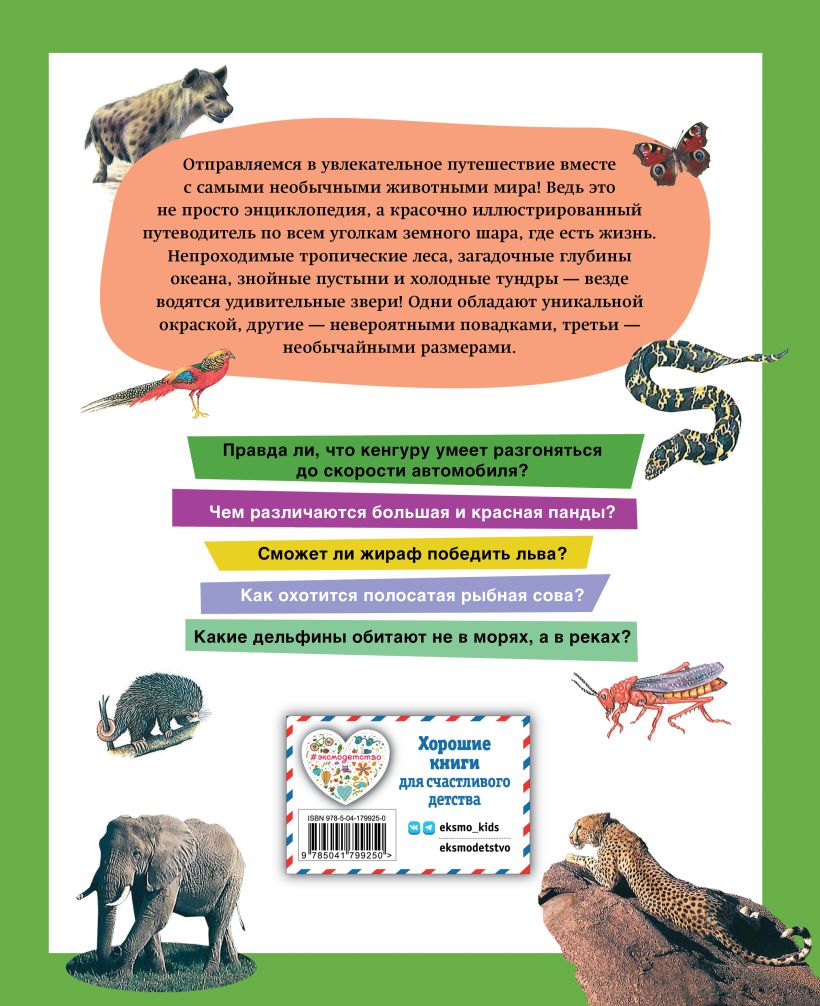 Эта захватывающая энциклопедия познакомит тебя с самыми необычными животными и уголками Земли. Восхитись коалами, игуанами и грифами, а также чудесными местами планеты — гейзерами, кратерами, вулканами и подводными ямами. Расширь свой кругозор, открывая для себя удивительные секреты окружающего мира! Знаешь ли ты, что пауки — это не насекомые? Почему извергаются гейзеры? А чем жирафы чистят уши? Эта книга о животных и невероятных уголках природы ответит на эти и многие другие неожиданные вопросы. Большие красочные иллюстрации и фотографии, а также специальный крупный, легко читаемый текст делают познавательный процесс интересным и понятным. А занимательные тесты в конце каждой главы помогут закрепить полученные знания. Издание для детей младшего школьного возраста. Компактный формат энциклопедии позволит не только читать ее дома, но и носить с собой. А еще она идеально подходит для совместного изучения всей семьей и станет прекрасным подарком по любому поводу!