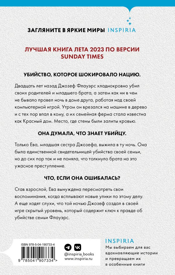 Двадцать лет назад Джозеф Флауэрс хладнокровно убил своих родителей и младшего брата, а затем как ни в чем не бывало провел ночь в доме друга, работая над своей компьютерной игрой. Утром он врезался на машине в дерево и с тех пор впал в кому, а их семейная ферма стала известна как Красный дом. Место, где стены были залиты кровью.