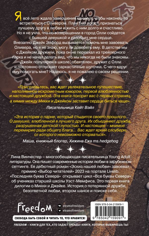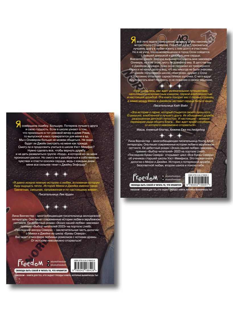 Комплект «Буквы Севера» Лины Винчестер — популярного автора молодежной сентиментальной прозы. Романтическая история Микки и Джейка в антураже американской школы и рок-группы напомнит вам романы «Всем парням, которых я любила», «Сделка», а также фильм «Простушка», и расскажет о потерянной дружбе, втором шансе, любви и о том, как важно ценить себя.