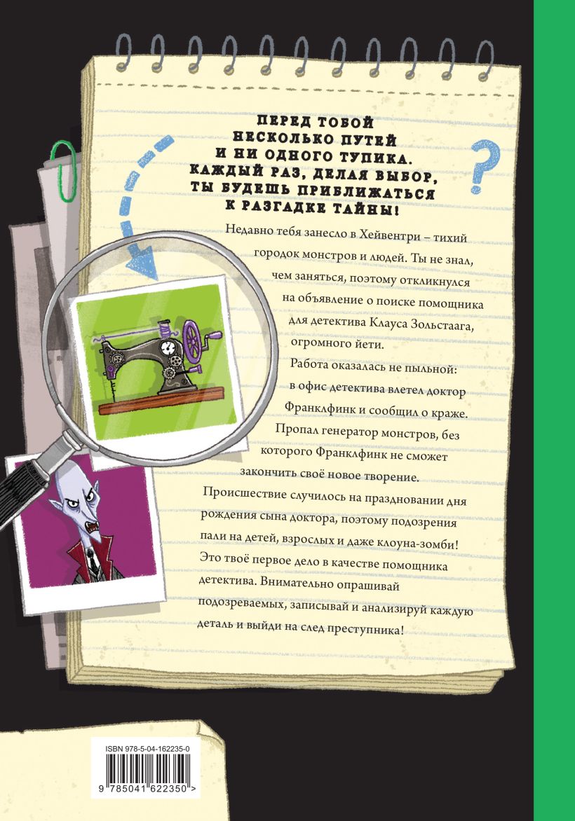 «Ты помощник детектива». Ты недавно прибыл в Хейвентри и откликнулся на вакансию помощника детектива-йети. Работа оказалась не пыльной: в офис влетел доктор Франклфинк и сообщил о краже. Пропал генератор монстров, без которого доктор не сможет закончить своё новое творение. Происшествие случилось на праздновании дня рождения сына Франклфинка, поэтому подозрения пали на детей, взрослых и даже клоуна-зомби!