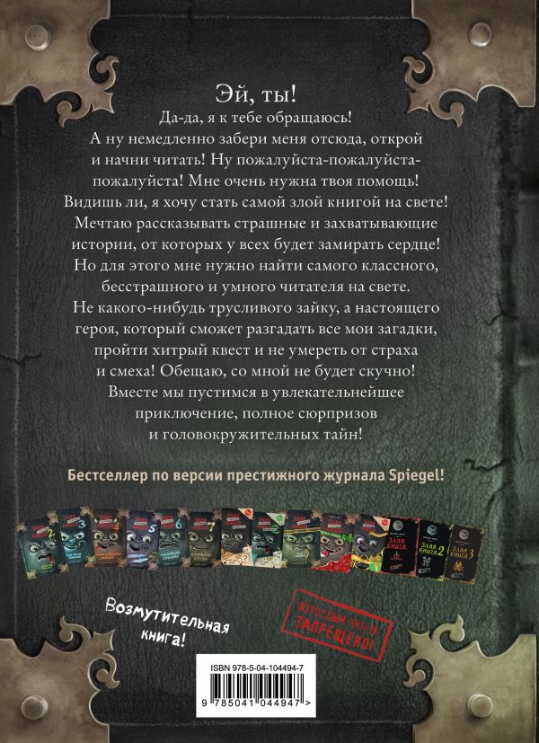 Первая книга международной серии-бестселлера — только в России продано более 600 000 экземпляров! Уникальный формат, сочетающий художественный текст + квест + разнообразные задания для читателей = книга-квест. Это издание создано для тех, кто считает, что читать — это скучно. Оно не оставит никаких сомнений, что с книгами можно классно проводить время: подтверждено тысячами положительных отзывов родителей! Секрет успеха серии в том, что книга ведёт живой, юмористический диалог с читателем, рассказывает ему страшные истории и приглашает в авантюрное приключение. Чтобы пройти всю книгу до конца (принимая решения на сюжетных развилках и переходя по разным страницам не по порядку), нужно разгадать немало загадок и головоломок, которые развивают внимание и мышление. Поэтому «Маленькой злой книге», которая хочет стать самой злой книгой на свете, без помощи читателя никак не обойтись! Книга-игра содержит множество атмосферных цветных иллюстраций и красивые шрифты, и понравится детям 7—11 лет. Тома серии можно читать в любой последовательности. Ещё выпущены специальные издания «Читай с друзьями», «Головоломки» и «Адвент», а также подсерия для подростков 11—13 лет «Злая книга».