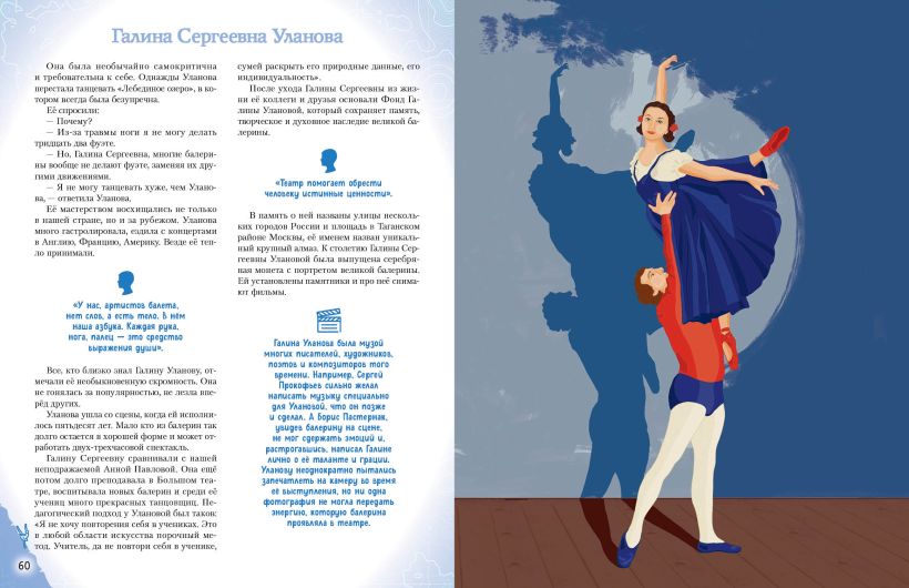 В этой увлекательной книге тебя ждёт 20 историй отечественных актёров, режиссёров, певцов и танцоров, чьи имена навсегда прославили Россию. Что за уникальные таланты позволили им покорить весь мир? Какими они были в детстве и юности, благодаря чему сумели отыскать своё предназначение, что помогло им преодолеть препятствия на пути и стать сильными, вдохновляющими других личностями? Найди собственный пример для подражания и узнай, какие качества в себе развивать, чтобы стать похожим на великих деятелей театра и кино, которыми гордится наша страна!