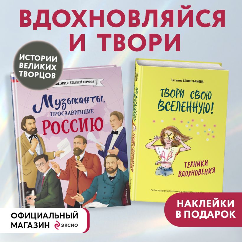 Комплект из 2-х книг с наклейками: «Техники вдохновения» + «Музыканты, прославившие Россию».