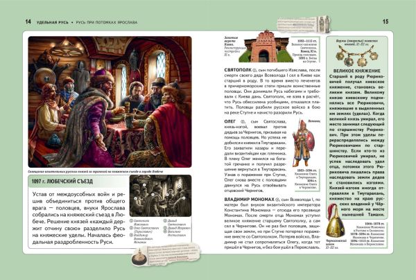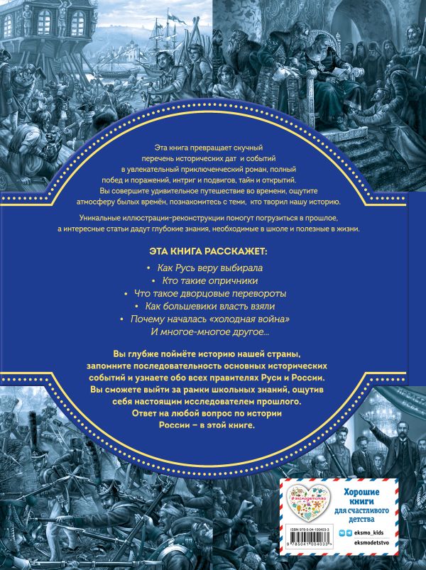 Эта великолепно оформленная подарочная энциклопедия превращает перечень исторических дат и событий в увлекательное путешествие сквозь время — в века, полные тайн и открытий, побед и поражений, дворцовых интриг и подвигов. Юные читатели ощутят атмосферу былой эпохи и познакомятся с великими людьми, которые творили историю России.
