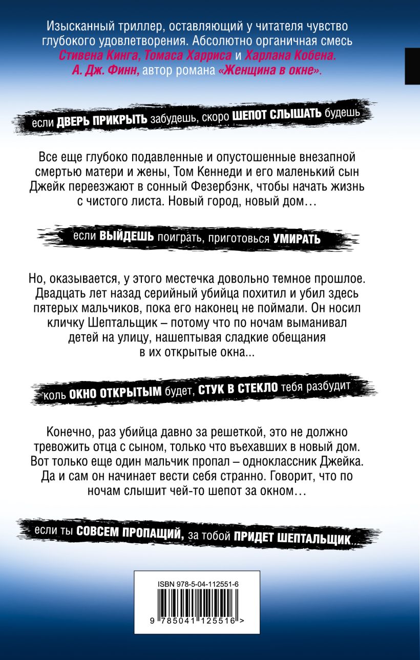 Двадцать лет назад серийный убийца, прозванный прессой Шептальщиком, устроил для жителей маленького английского городка Фезербэнк настоящий ад. Он похищал маленьких мальчиков, нашептывая посулы и обещания в их открытые окна. А потом жестоко убивал.