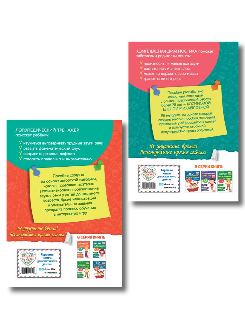 Комплект книг для детей 3, 4, 5, 6, 7 лет от издательства «Эксмо» поможет достичь отличного результата в формировании красивой и грамотной речи дошкольника и обеспечит успех при поступлении в первый класс. Логопеды-эксперты Елена Косинова и Ольга Перова — авторы бестселлеров, по которым занимаются несколько поколений детей. Методики с доказанной эффективностью — хит как у специалистов-логопедов России, так и у родителей, которые хотят сэкономить семейный бюджет и заниматься с ребенком самостоятельно без привлечения платных педагогов. Просто, понятно, легко применить на практике!