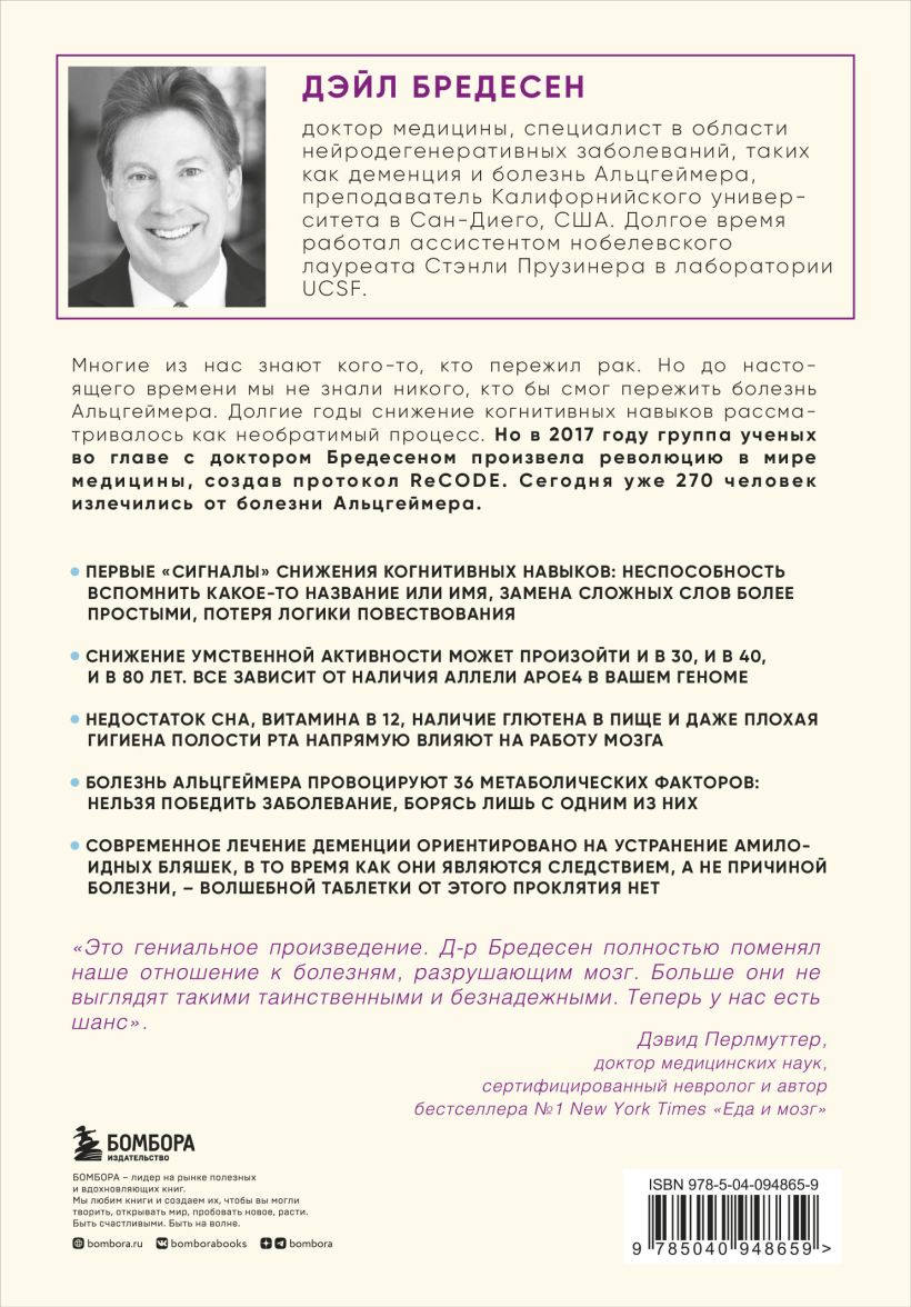 Самое знаковое открытие в области изучения когнитивных функций мозга. Впервые за всю историю человечества разработана система, позволяющая остановить и обернуть вспять развитие заболеваний, которые связаны с мыслительной деятельностью человека: болезнь Альцгеймера, деменцию и др. Ранее не было ни одного случая выздоровления и не существовало ни одного лекарства, которое бы показало свою эффективность. Специалист в области нейродегенеративных заболеваний, Дейл Бредесен выделил 36 метаболических факторов, которые приводят к снижению умственной деятельности человека. Устранив их, вы сможете быть уверены в своем мозге на 100% в любой промежуток своей жизни.