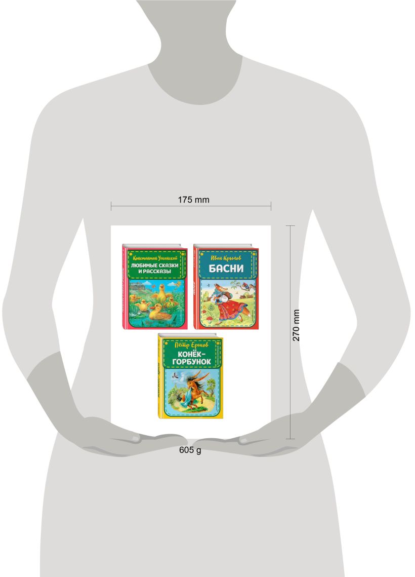 В комплект вошли 3 книги: «Конёк-горбунок» Петра Ершова, «Любимые сказки и рассказы» Константина Ушинского, «Басни» Ивана Крылова.