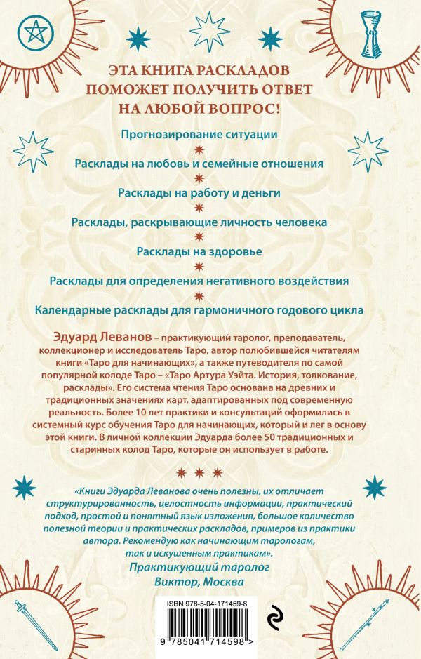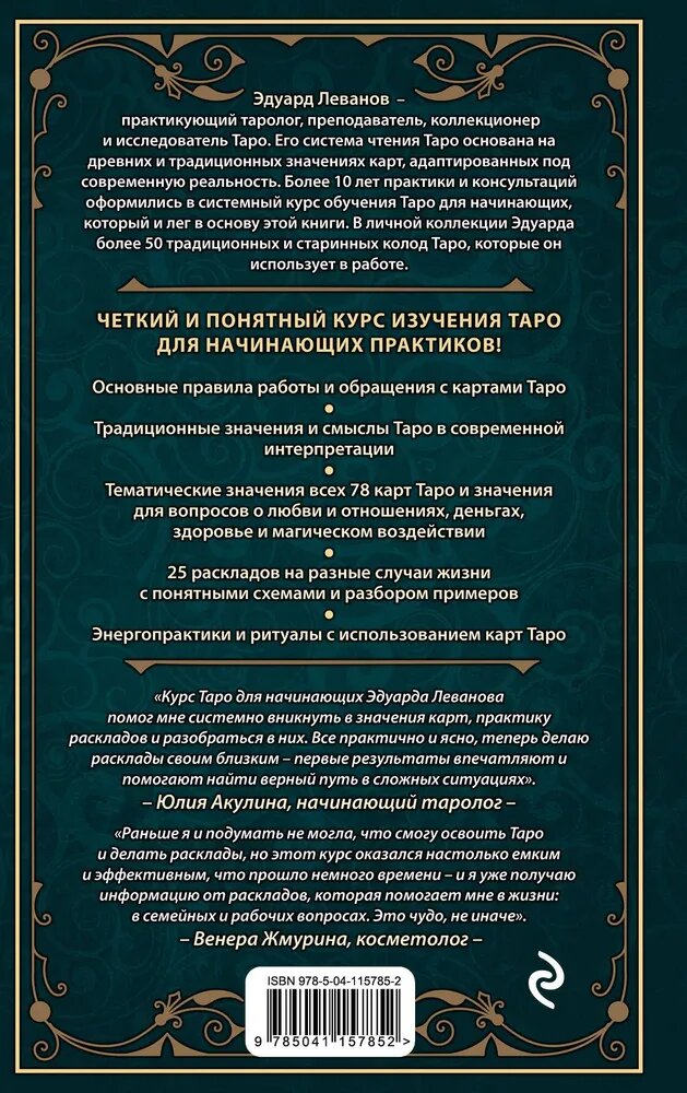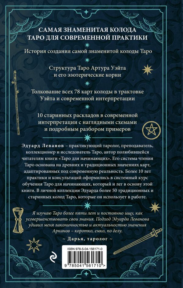 «Таро Уэйта» — изучаем подробно, системно и «с нуля». Эта книга для тех, кто хочет научиться читать легендарное Таро Уэйта и обращаться к картам за советом в своей повседневной жизни. Подробное системное руководство преподавателя и таролога Эдуарда Леванова поможет вам быстро запомнить толкования карт и изучить тайный язык Таро. • Базовое историческое толкование карт в прямом и перевернутом положении. • Современные значения карт для любовной, профессиональной и финансовой сфер. • Значения карт в качестве «карты дня» для быстрых предсказаний. • Рекомендации по работе с колодой и общие правила раскладов. • Более 20 тренировочных раскладов, которые помогут ответить на самые волнующие вопросы с примерами. Эдуард Леванов — таролог, преподаватель, коллекционер и исследователь Таро, автор полюбившейся читателям книги «Таро для начинающих», путеводителя по самой популярной колоде Таро — «Таро Артура Уэйта. История, толкование, расклады», также книги по раскладам «100 раскладов Таро на все случаи жизни». Его система чтения Таро основана на древних и традиционных значениях карт, адаптированных под современную реальность. В личной коллекции Эдуарда более 50 традиционных и старинных колод Таро, которые он использует в работе.