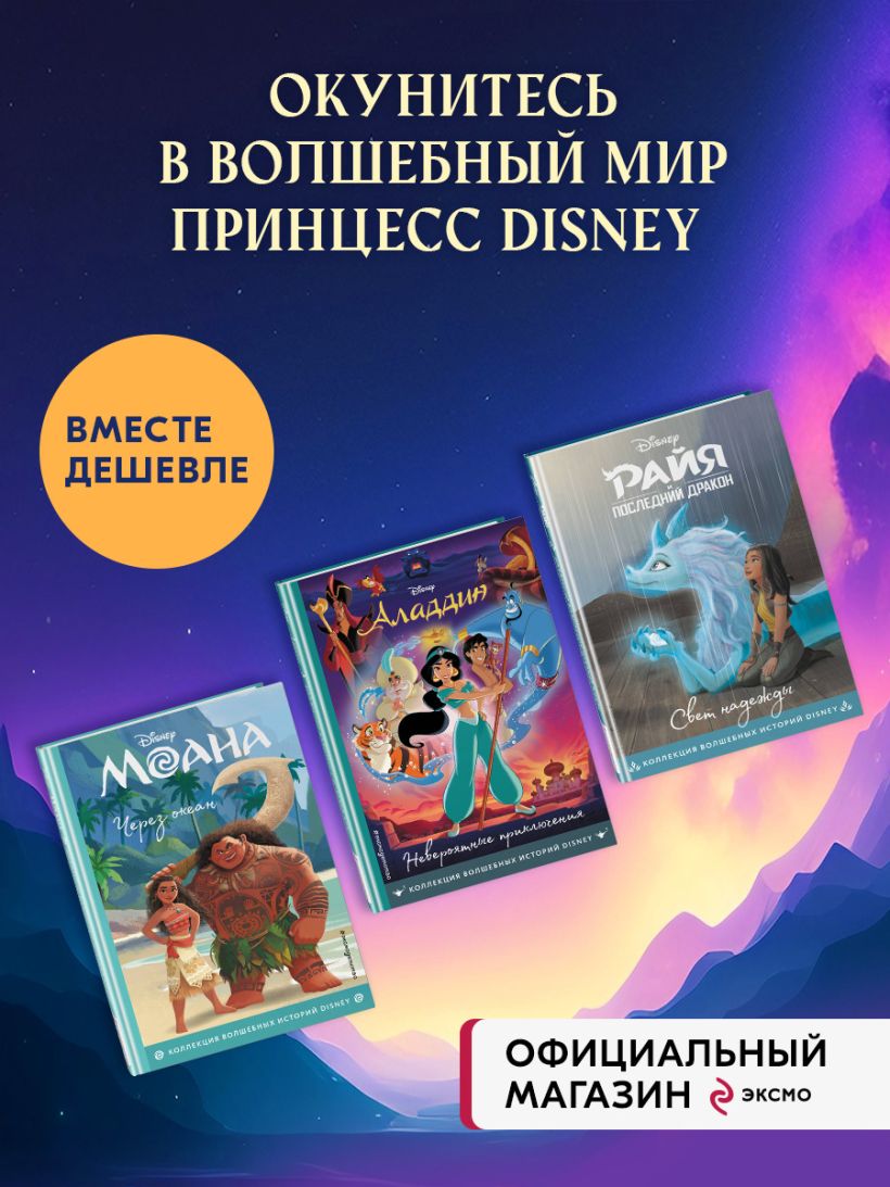 Комплект их 3-х книг по мотивам известных мультфильмов от студии Disney: «Райя и последний дракон. Свет надежды», «Моана. Через океан» и «Аладдин. Невероятные приключения».