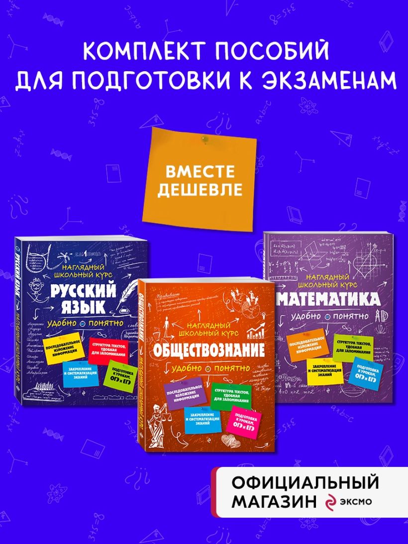 В комплект вошли следующие книги из популярной серии «Наглядный школьный курс: удобно и понятно»: «Русский язык», «Математика» и «Обществознание».