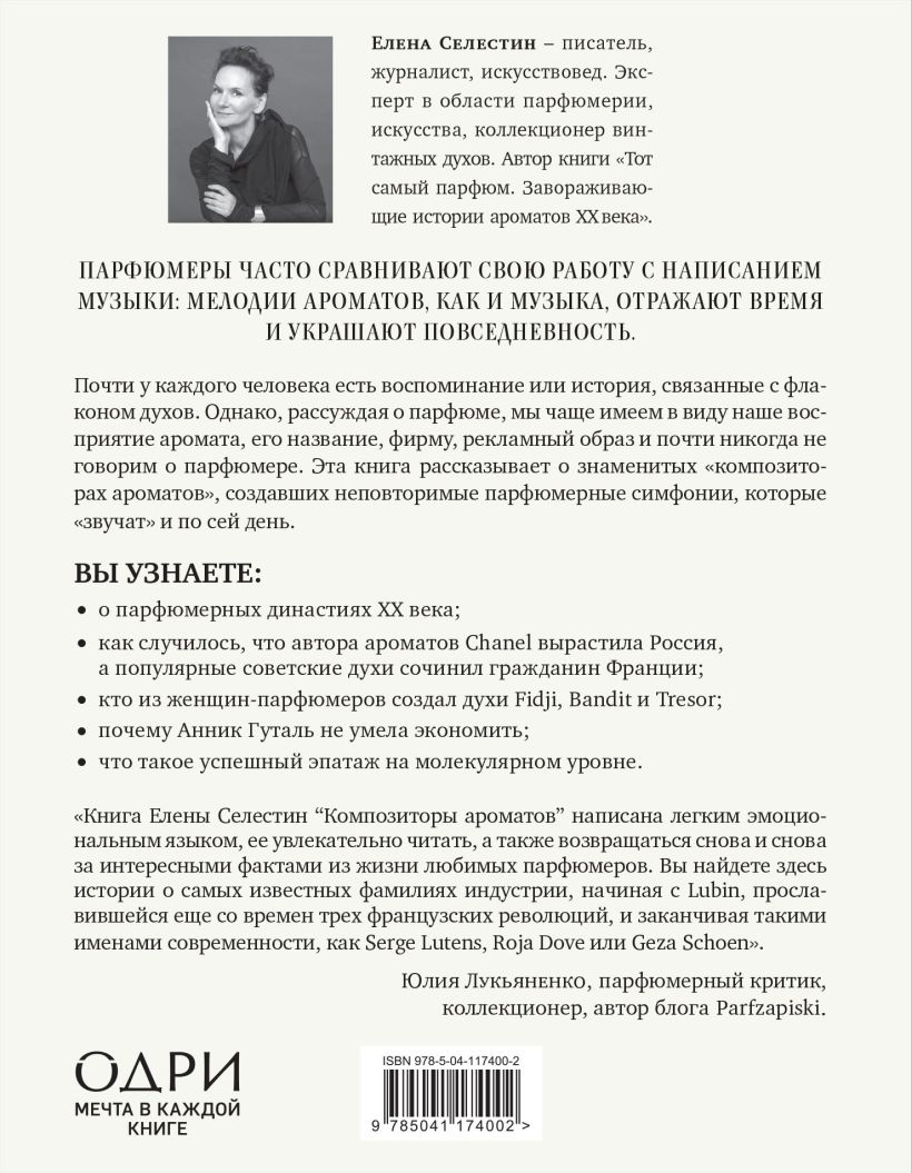 Если вы любите ароматы и духи для вас не просто парфюмерная композиция, а нечто большее — настроение, воспоминания, вдохновение, — то эта потрясающе красивая книга с великолепными иллюстрациями — для вас. Ее автор, Елена Селестин, эксперт в области парфюмерии и искусства, рассказывает о том, как создавались лучшие ароматы ХХ века. Вы узнаете, почему мадемуазель Шанель была недовольна успехом Chanel № 5; в чем драма создателя «Красной Москвы»; почему Diorissimo пахнут ландышами; каким образом парфюм спас «высокую моду» Парижа; в каких странах запрещен Opium YSL и многое другое. Легендарные духи — это не только портрет эпохи, но и судьбы, полные драм, озарений, это истории успеха с почти детективными сюжетами.