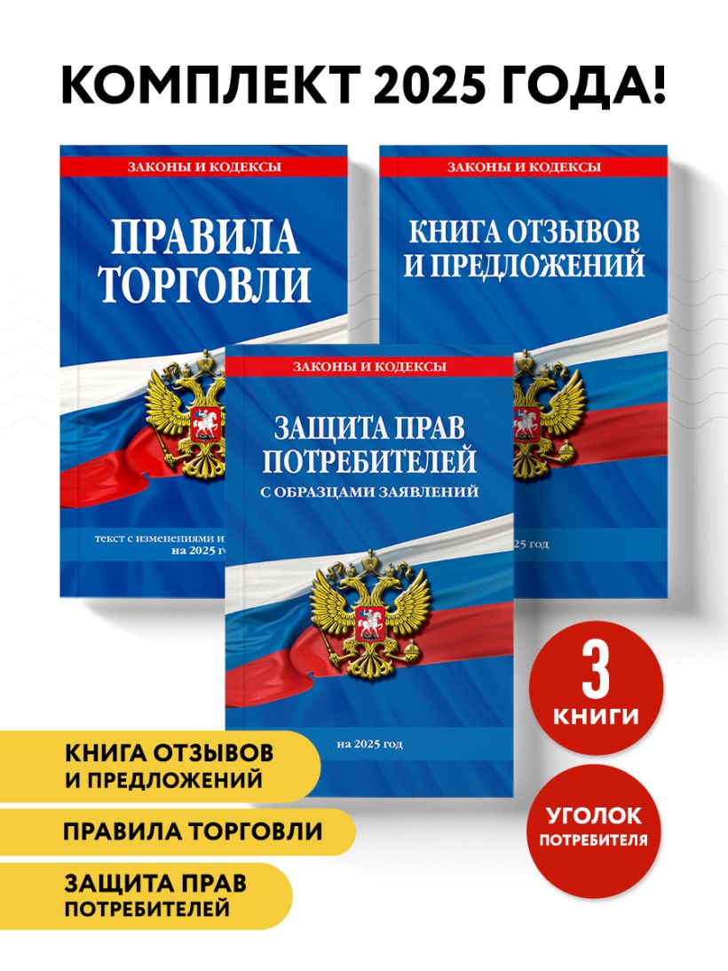 В комплект входят: «Защита прав потребителей с образцами заявлений на 2025 г.», «Книга отзывов и предложений 2025 год», «Правила торговли: текст с изм. и доп. на 2025 год».