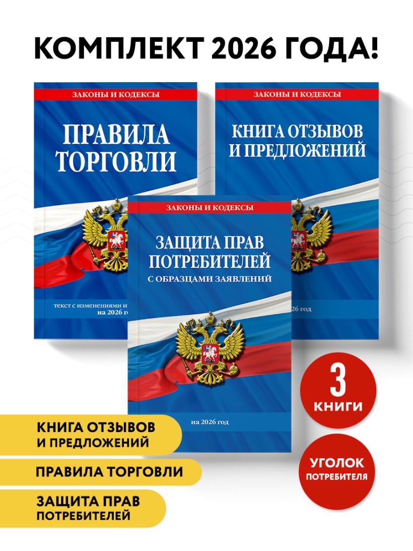 В комплект входят: "Защита прав потребителей с образцами заявлений на 2026 г.", "Книга отзывов и предложений 2026 год", "Правила торговли: текст с изм. и доп. на 2026 год".