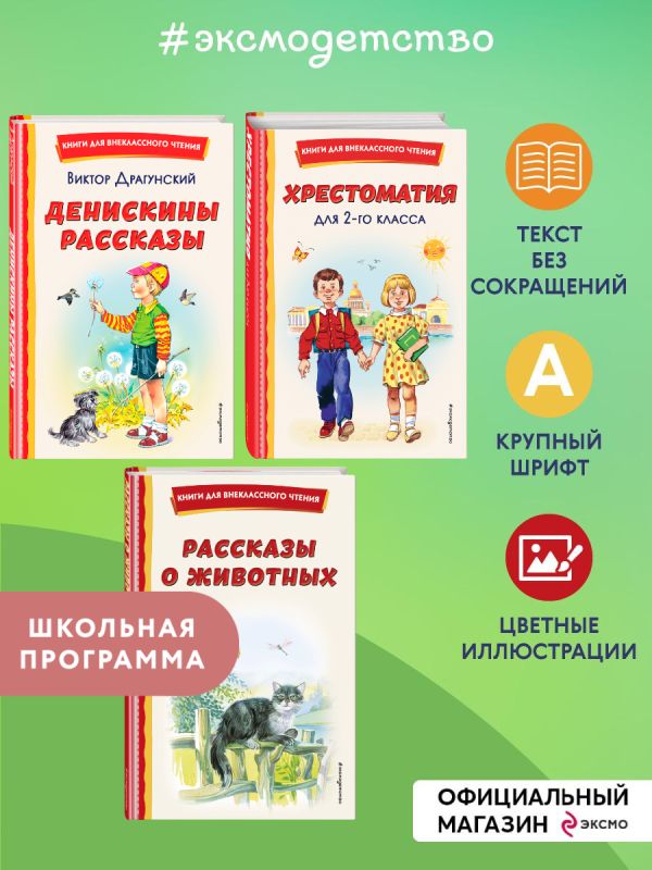 В комплект вошли книги, которые помогут ученикам второго класса эффективно подготовиться к урокам чтения: "Хрестоматия для 2-го класса", "Рассказы о животных и "Денискины рассказы" Виктора Драгунского. Белая бумага, удобный формат и цветные иллюстрации – всё, что нужно для комфортного детского чтения.