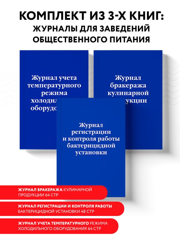 Комплект из 3-х книг: Журнал бракеража кулинарной продукции Журнал учета температурного режима холодильного оборудования Журнал регистрации и контроля работы бактерицидной установки
