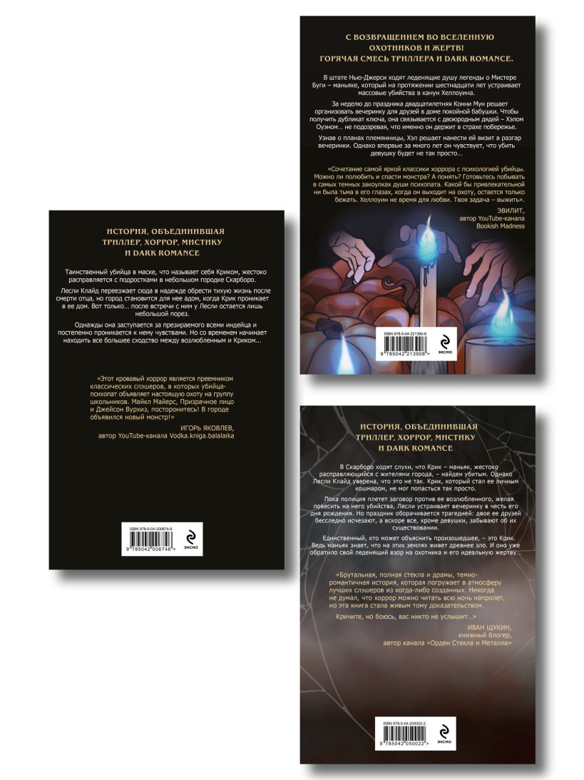 «Сочетание самой яркой классики хоррора с психологией убийцы. Можно ли полюбить и спасти монстра? А понять? Готовьтесь побывать в самых темных закоулках души психопата. Какой бы привлекательной ни была тьма в его глазах, когда он выходит на охоту, остается только бежать. Хэллоуин не время для любви. Твоя задача — выжить». — Эвилит, автор книжного YouTube-канала «Bookish Madness»