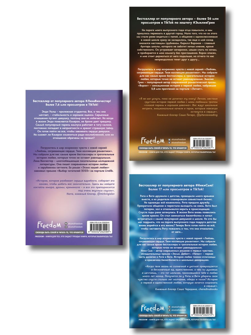 Мы собрали для вас самые яркие бестселлеры и трогательные истории любви, которые точно не оставят равнодушными. Приготовьтесь смеяться, плакать, переживать и влюбляться вместе с нашими героями! Книги в мягких обложках с изображениями персонажей, которые удобно взять с собой! В подарок к каждой книге вы получите полароидную открытку с героями!