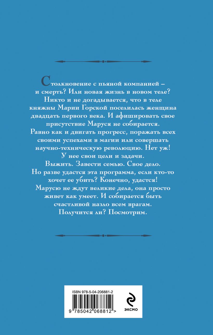 Столкновение с пьяной компанией — и смерть? Или новая жизнь в новом теле? Никто и не догадывается, что в теле княжны Марии Горской поселилась женщина двадцать первого века. И афишировать свое присутствие Маруся не собирается. Равно как и двигать прогресс, поражать всех своими успехами в магии или совершать научно-техническую революцию. Нет уж! У нее свои цели и задачи. Выжить. Завести семью. Свое дело. Но разве удастся эта программа, если кто-то хочет ее убить? Конечно удастся! Марусю не ждут великие дела, она просто живет как умеет. И собирается быть счастливой назло всем врагам. Получится ли? Посмотрим.